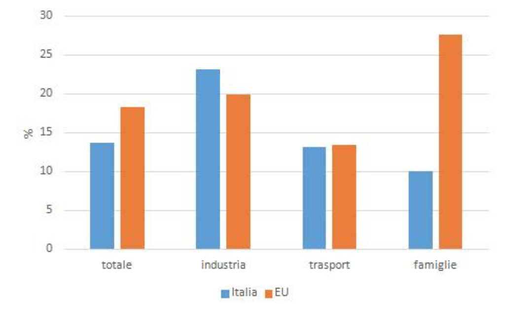 L’Italia è tra i Paese più efficienti d’Europa: il grafico sotto riportato mostra che, dal 2000 al 2015, ha avuto un guadagno di efficienza di circa 15 punti percentuali. L’Industria, in particolare, è il settore che ha registrato i risultati migliori, superiori anche rispetto all’Europa.