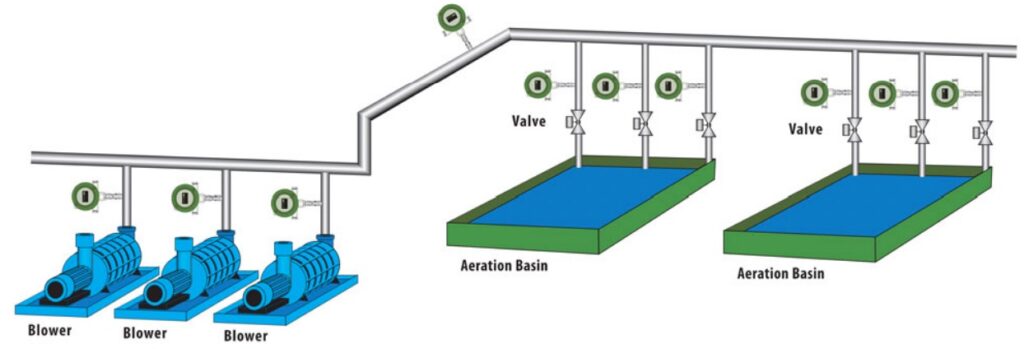 I misuratori di portata massica termica possono essere installati nel collettore principale per misurare la portata d’aria totale dal ventilatore/compressore: in questo caso non c’è il controllo del flusso d’aria in ciascuna vasca e il misuratore semplicemente monitora il flusso d’aria per controllare le prestazioni del ventilatore.