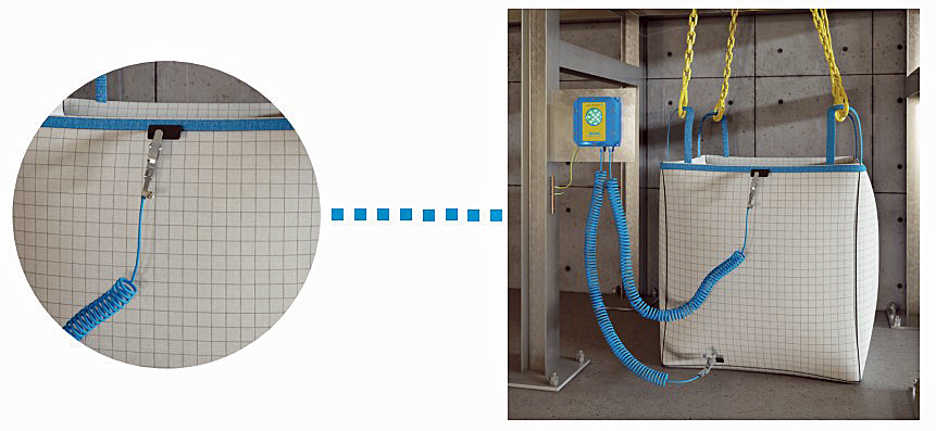 Il sistema di messa a terra elettronico MT40, costituito da un monitor dotato di display a LED e di un cavo con pinza, permette di garantire la sicurezza delle operazioni di carico e scarico dei big bags ed evita che polveri e granulati con conduttivi, trasferiti ad alta velocità, si carichino di elettricità statica dando luogo a pericolo di incendio e di esplosione.