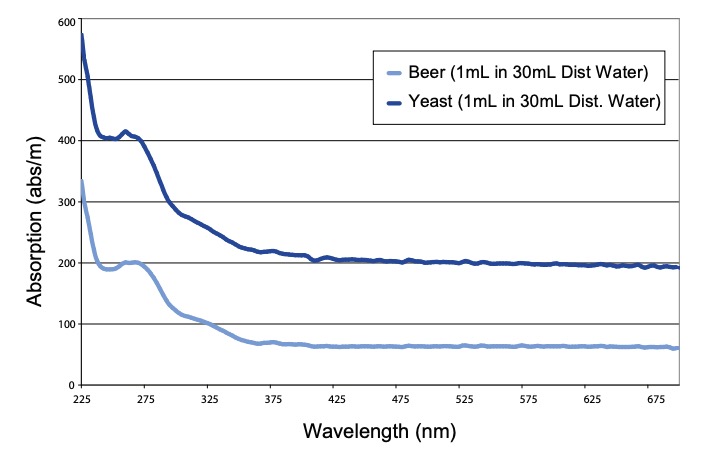 Spettro di assorbimento di birra e lievito in acqua distillata. Il segnale di assorbanza era sufficientemente forte e specifico per la rilevazione e quantificazione nella matrice acque di scarico.