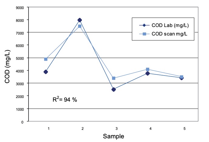 La misura fotometrica del COD (chemical oxygen demand) con la sonda mostra un’alta correlazione con i campioni analizzati in laboratorio.
