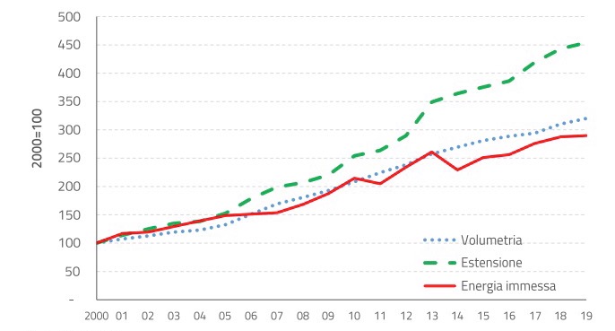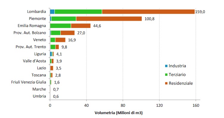 Il 42% circa della volumetria riscaldata complessiva è concentrata sul territorio della Lombardia (159 milioni di m3); seguono Piemonte (101milioni di m3, 27%del totale) ed Emilia Romagna (45milioni di m3, 12% del totale).