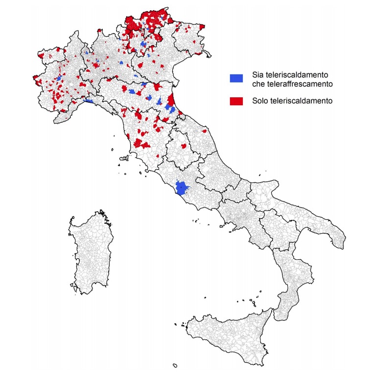 Nella figura qui riportata sono evidenziati i territori comunali nei quali si rileva almeno una rete di teleriscaldamento (in rosso) e almeno una rete di teleraffrescamento (in azzurro) in esercizio: come si può notare, le reti di teleriscaldamento sono largamente prevalenti; negli anni si è tuttavia consolidata anche la presenza di reti di teleraffrescamento, sempre associate a quelle di teleriscaldamento.
