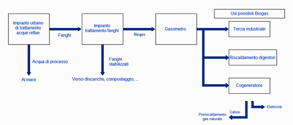 Il biogas prodotto negli impianti di depurazione delle acque in seguito alla digestione anaerobica dei fanghi può essere utilizzato come combustibile di un sistema di cogenerazione (CHP) per produrre energia elettrica e termica rinnovabile, contribuendo alla riduzione della produzione energetica da combustibili fossili e, di conseguenza, delle emissioni in atmosfera di CO2.