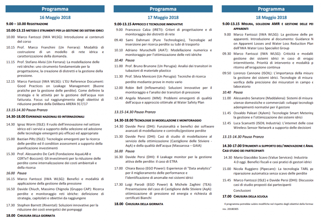 Il corso si prefigge l’obiettivo di fornire un aggiornamento tecnico-scientifico e normativo sulle tematiche connesse alla gestione delle reti idriche ed alla selezione e progettazione degli interventi di efficientamento. In particolare verrà fornita una preparazione specifica sulle modalità di applicazione della metodologia best practice dell’IWA (International Water Association) per la gestione dell’acqua non fatturata (calcolo del bilancio idrico e dei KPIs IWA, analisi delle portate notturne, valutazione delle performance nella gestione dell’acqua non fatturata e criteri per la scelta e programmazione delle attività più adeguate di controllo delle perdite).
