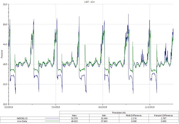 A seguire si riporta un esempio di confronto tra dati misurati e dati restituiti da modello in fase di calibrazione di un modello numerico per rete di acquedotto: