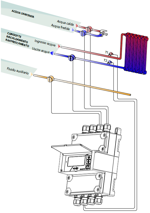A energia é então calculada usando um medidor de fluxo com pulso ou saída analógica, uma calculadora de energia e um par de sondas de temperatura.